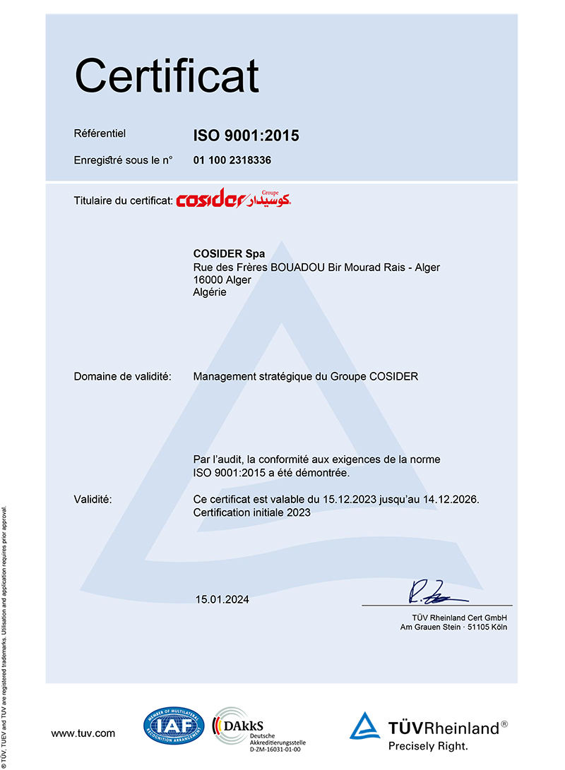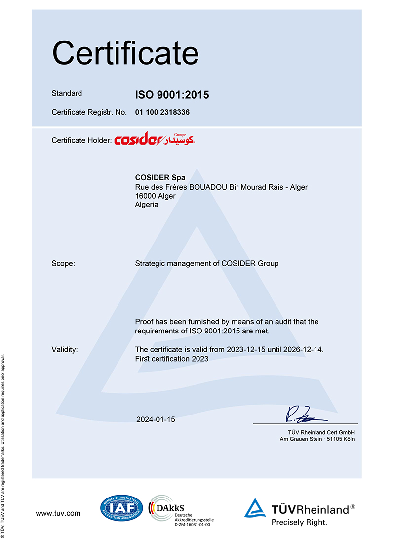 Le Groupe COSIDER, Entreprise Publique Economique, tient a annoncer à l’ensemble de ses partenaires que le processus de sa certification (renouvellement de son certificat « ISO 9001 :2015 »), a été accompli avec succès. Il est à rappeler que cette certification concerne le management stratégique du Groupe COSIDER.